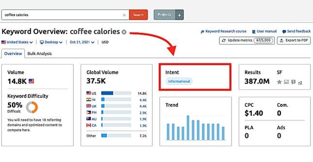 Lượng calo bên trong một loại cà phê (là bao nhiêu) (được xếp loại là “từ khóa thông tin” như hình bên dưới)